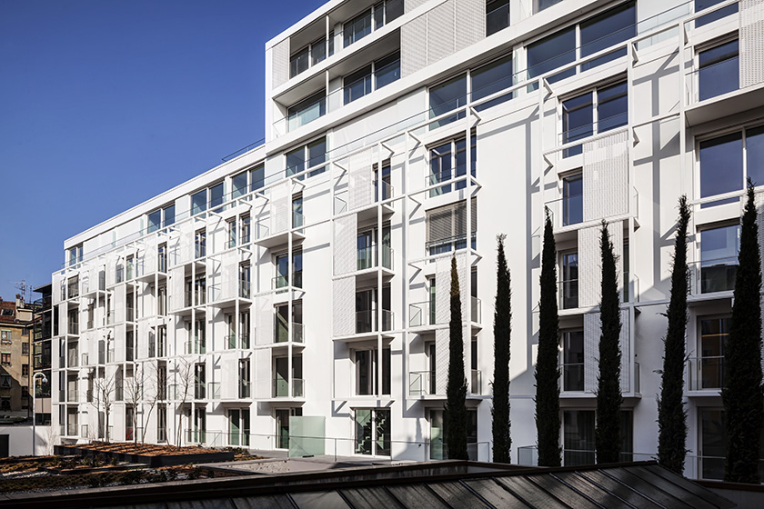De nombreuses ouvertures qui allient avec style structures métalliques, balcons et claustras. La végétalisation de la cour offre aux résidents une incursion de verdure qui contribue à préserver l’intimité des appartements.